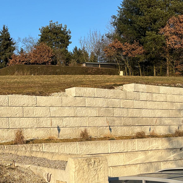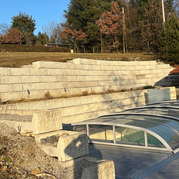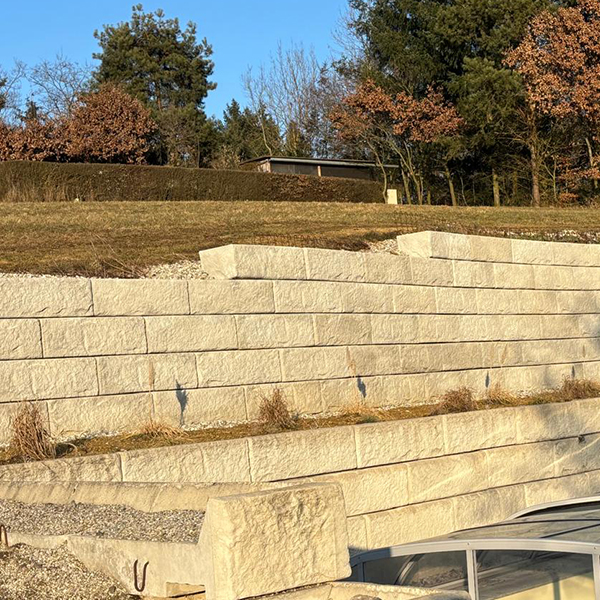 Eine abgestufte Stützwand mit einer Zwischenebene wurde zur Absicherung eines Hanges oberhalb des Schwimmingpooles eines Einfamilienhauses in Holzwinden errichtet.