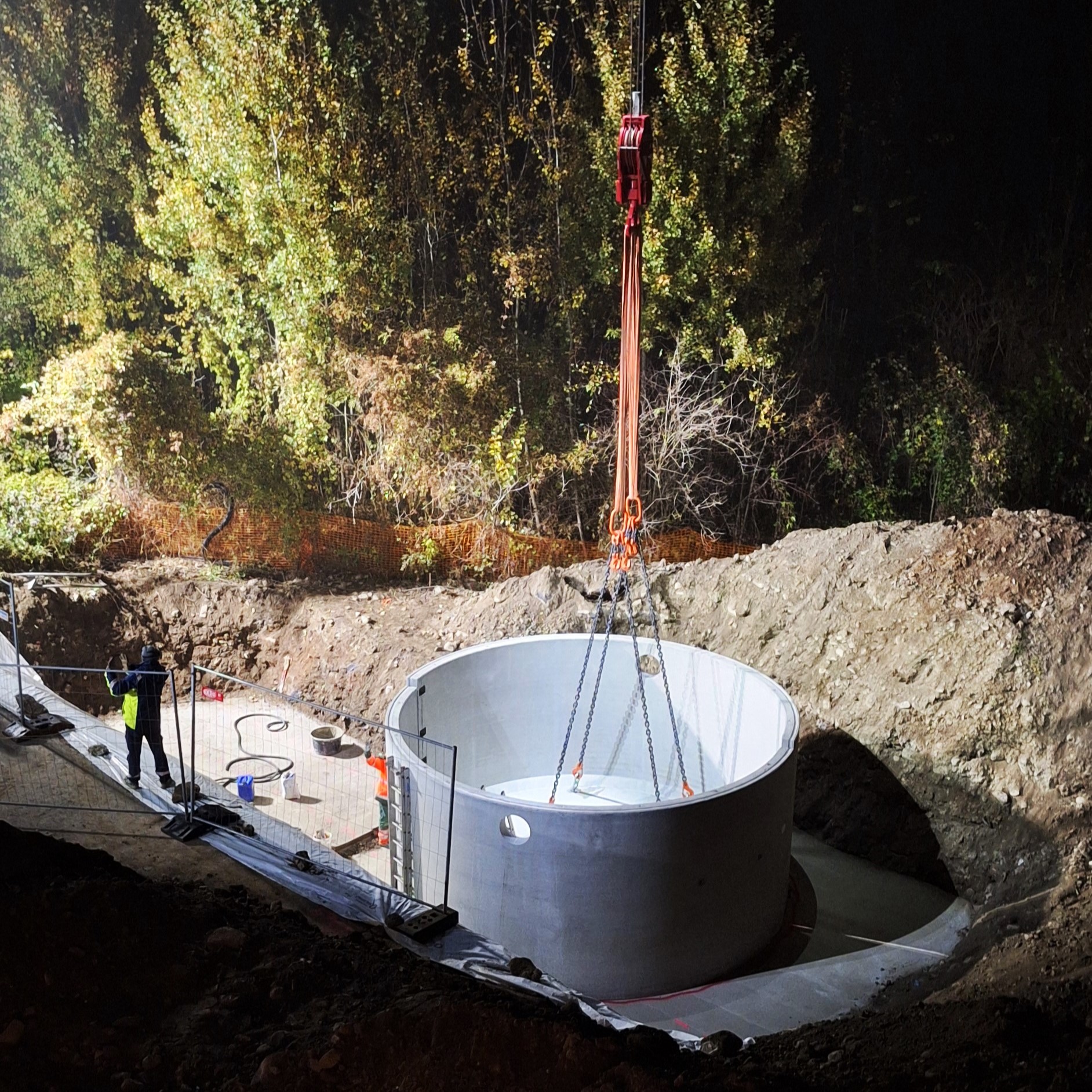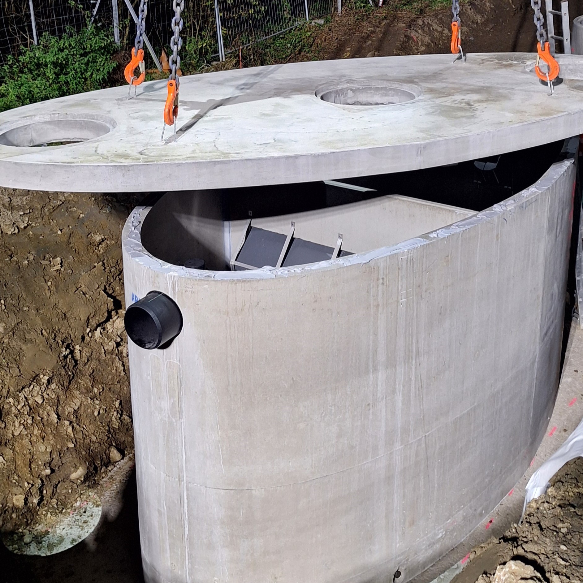 Im Bereich einer Autobahn-Mautstelle wurden zwei Verkehrsflächensicherungsschächte und vier Störfallbecken versetzt, um eine normkonforme Reinigung der belasteten Straßenabwässer zu gewährleisten. Dank der Fertigteil-Bauweise konnte der Einbau schnell erfolgen, wodurch die Beeinträchtigung des Mautbetriebs minimiert wurde.