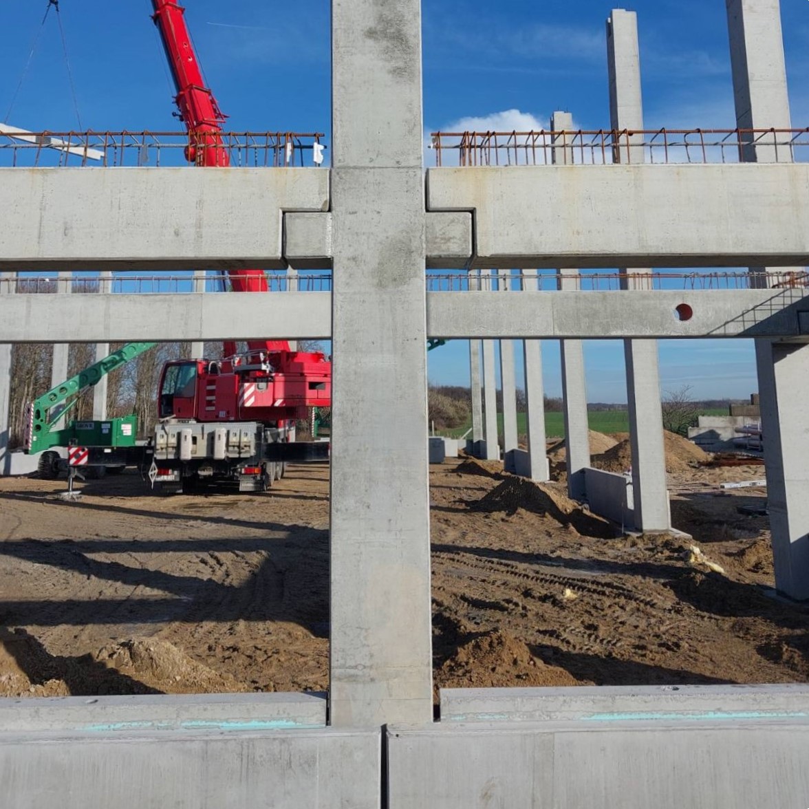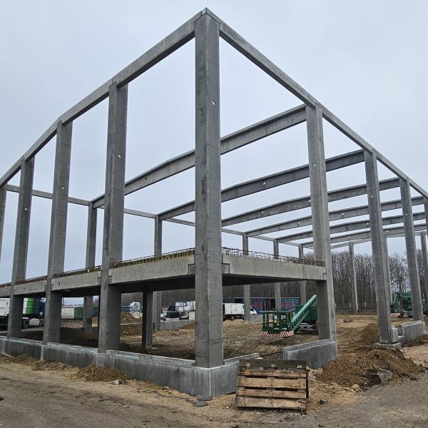 A seregélyesi hulladékdaráló üzem új csarnokot és irodát épít. A közel 1.000 m² alapterületű beruházás előregyártott vasbeton vázszerkezeti kivitelezésében vettünk részt. A 20 m fesztávú egyhajós csarnok 25 pillér, 19 hőszigetelt lábazati panel, 10 födémgerenda, 22 peremgerenda és 6 feszített szelemen felhasználásával épült fel, az irodarészen 120 m² szintosztó födém került beépítésre. Az építkezésre kiszállított betonelemek összsúlya 390 tonna.