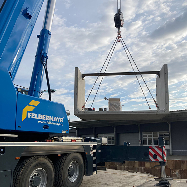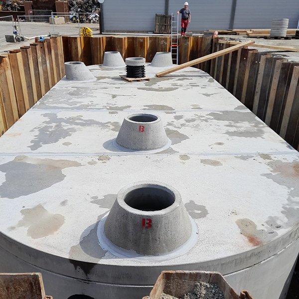 Errichtung einer Großabscheideanlage mit einer Nenngröße von 400 l/s für die Entwässerung von befestigten Freiflächen bei der Firma Scholz Rohstoffhandel in Wien. Die Anlieferung der Schachtteile sowie das Abladen erfolgte aufgrund der Sondertransporte in den Nachtstunden.