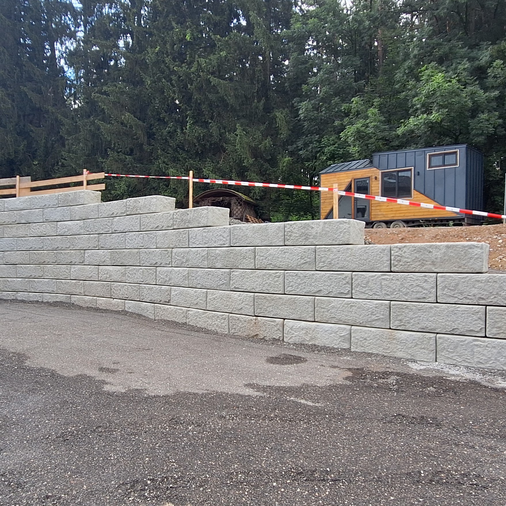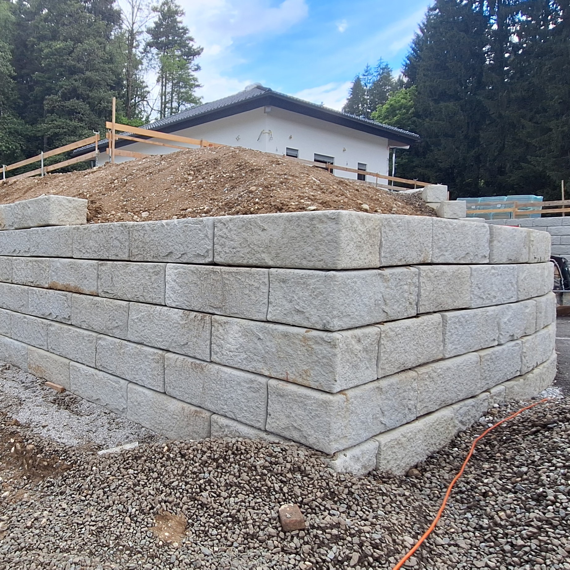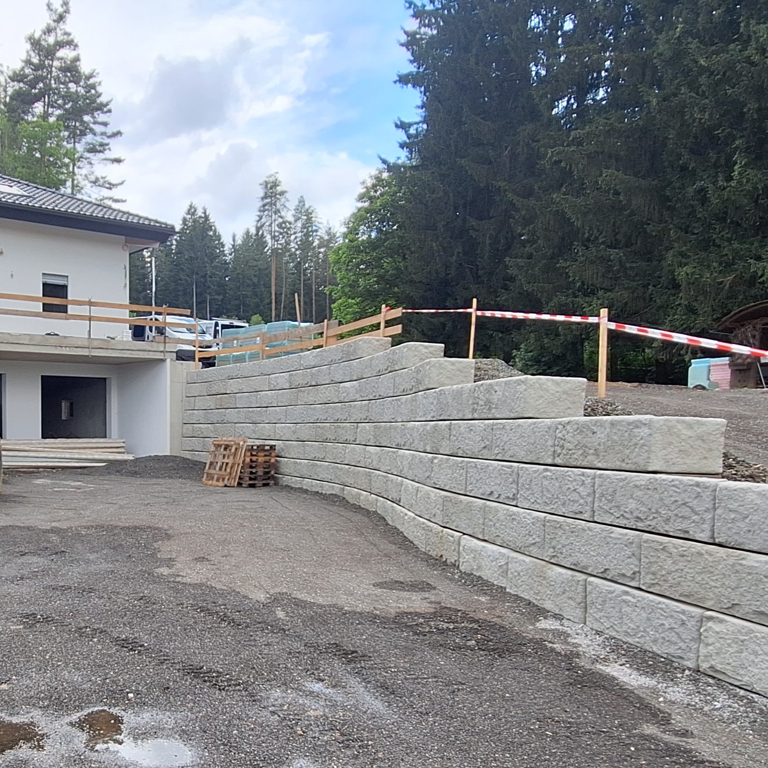 Mit dem SW-Stützwandsystem konnte einerseits die Zufahrt zum Haus gesichert und andererseits die Gartenfläche stabilisiert werden. Durch die Granitoberfläche der Steine fügt sich das Mauerwerk harmonisch in die Umgebung ein.
