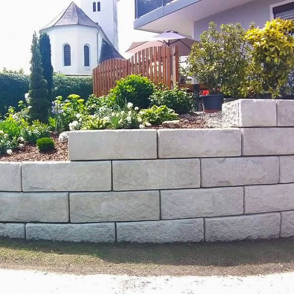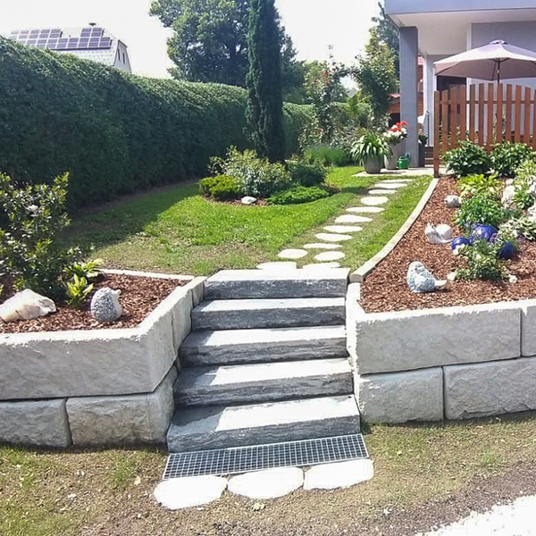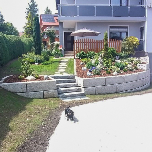 Durch die SW-Stützwand in Kombination mit den SW-Stufenplatten wurde der Vorgarten perfekt „eingerahmt”. Durch die Verlegung im Bogen sowie der Mauerabstufung fügt sich die SW-Stützmauer perfekt in die örtlichen Gegebenheiten ein.