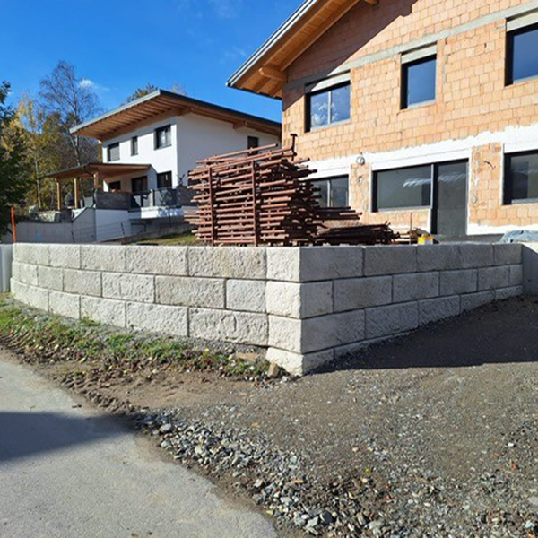 Durch das SW-Stützwandsystem konnte eine stabile Hangsicherung neben dem Haus sowie ein Niveauausgleich vor dem Haus geschaffen werden.