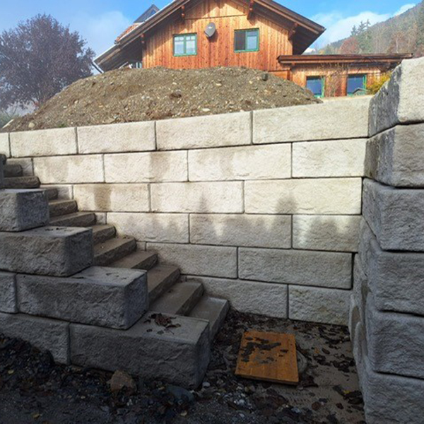 Hier konnte mit dem SW-Stützwandsystem ein massiver Höhenunterschied zwischen zwei Grundstücken platzsparend ausgeglichen werden. Trotz der Höhe der Stützmauer fügt sich diese harmonisch in die bestehende Architektur ein. Dank der SW-Stufenplatten, in Kombination mit den SW-Vollsteinen, konnte darüber hinaus ein praktischer Stiegenzugang verwirklicht werden.