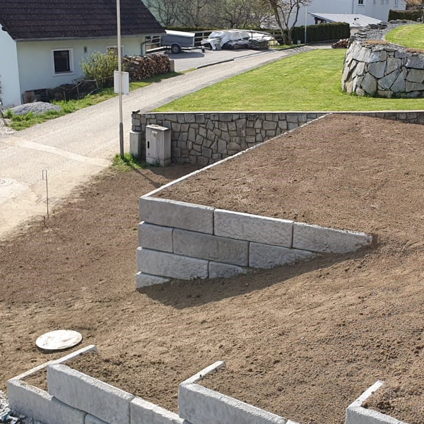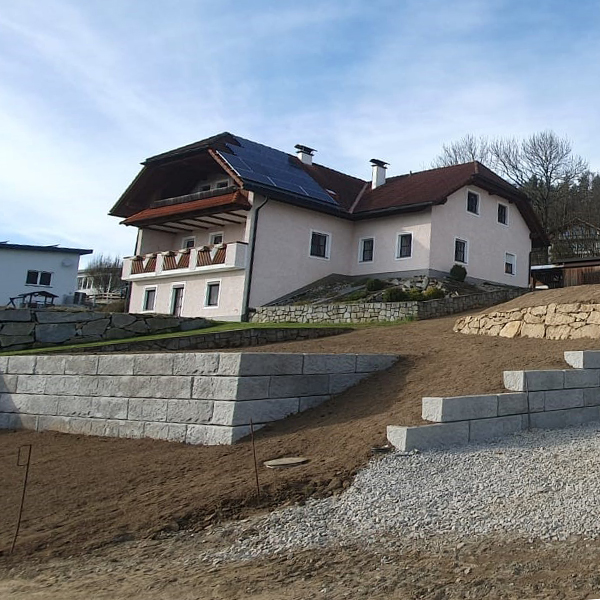 Zu einem neu sanierten Haus gehört auch ein neuer Garten, das dachte sich unser Kunde aus Oepping im Mühlviertel. Um den dazu benötigten Platz zu gewinnen, musste jedoch vorher der vorhandene Hang geebnet werden. Auf der Suche nach einer schnellen, sicheren und wirtschaftlichen Lösung wurde er schnell bei uns fündig. Mit dem SW-Stützwandsystem konnte eine hervorragende Lösung geschaffen werden.